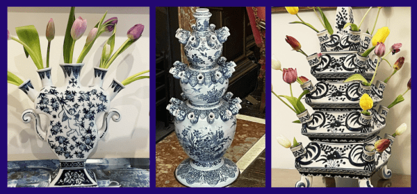 In the 1630s the Dutch went crazy for tulips, and now, nearly 400 years later, I’m mad for my new Delft tulip vase from Holland. Every Spring, when the tulips bloom, my heart yearns for a tulip vase, and this year, I finally bought one. It’s a big one: 24 inches tall (60 cm) with 5 stacking levels. Each level holds water and has 4 “spouts” or openings with an extra one at the top. That makes 21 individual “spouts,” so I immediately ran out and bought two big bunches of tulips to fill it.