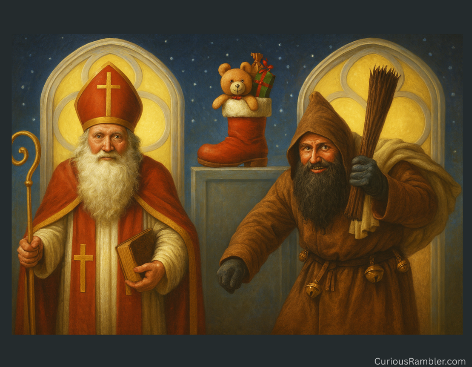 Misbehaving children in Europe have to be very careful the first part of December. Saint Nicholas day is December 6, and that is the day the kindly saint appears and distributes gifts to obedient children… but beware, he has a not-so-nice “helper” who tags along with him.