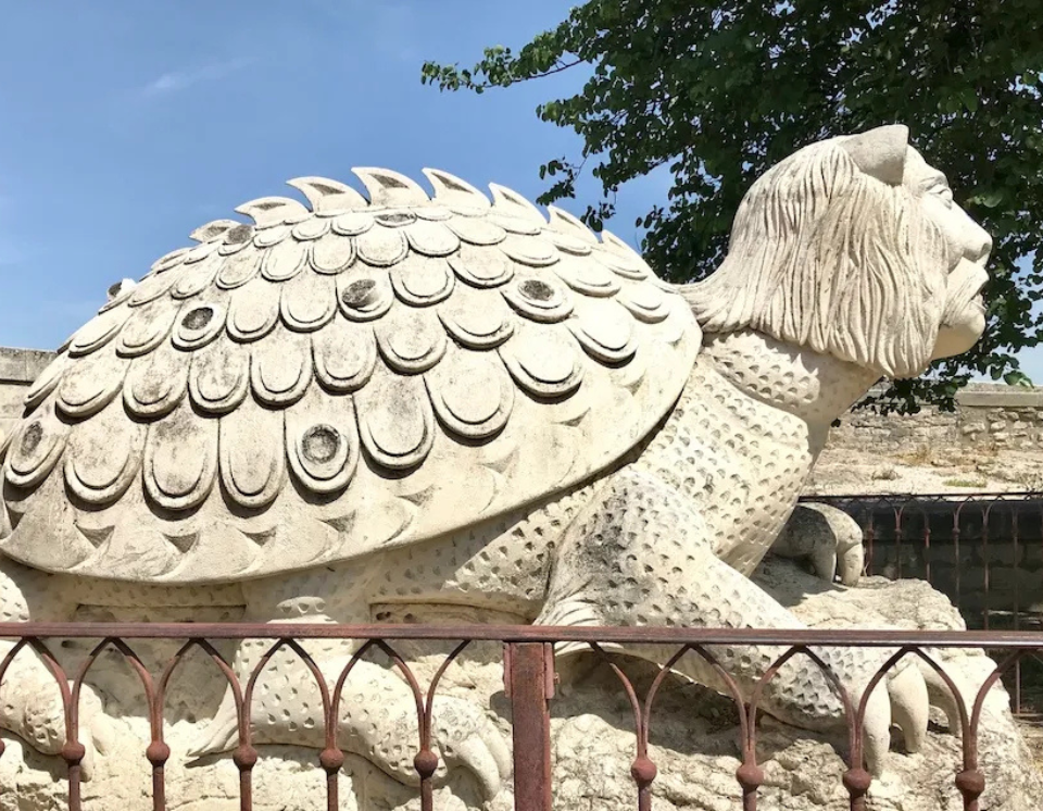 At that time, on the banks of the Rhone River, between Avignon and Arles, there was a fearsome monster terrorizing the region. It was called a Tarasque, and it was a horrendous creature. It had the face of a lion and razor-sharp teeth. Its body was similar to a dragon, and it had six legs ending in claws so sharp that one swipe could slice a boat in half. On its back was an armored shell, like that of a turtle, with spikes running along it, and to finish off, it had a tail that it used like a whip.